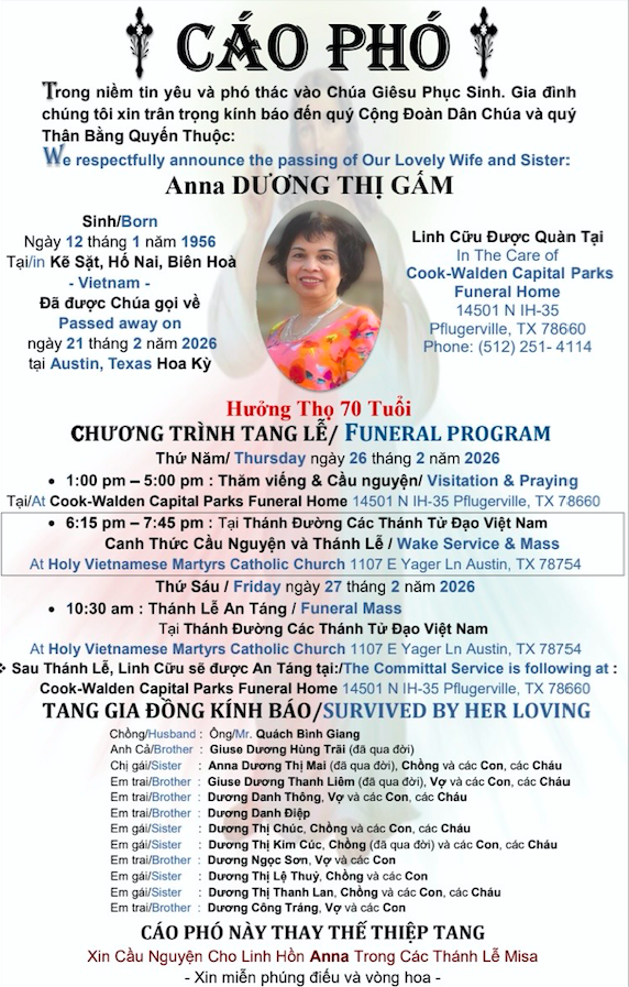 Chương Trình Giáo Lý Cho Người Dự Tòng và Người lớn chưa lãnh Nhận Bí Tích Thêm Sức sẽ bắt đầu vào Chúa Nhật ngày 13 tháng 7 năm 2025 và kết thúc vào ngày 12 tháng 4 năm 2026. Lớp sẽ học vào mỗi Ngày Chúa Nhật từ 8:30AM đến 9:30AM. Xin liên lạc với Souer Ane Nguyen (512) 736-7463 or, email: anenguyen@aol.com.